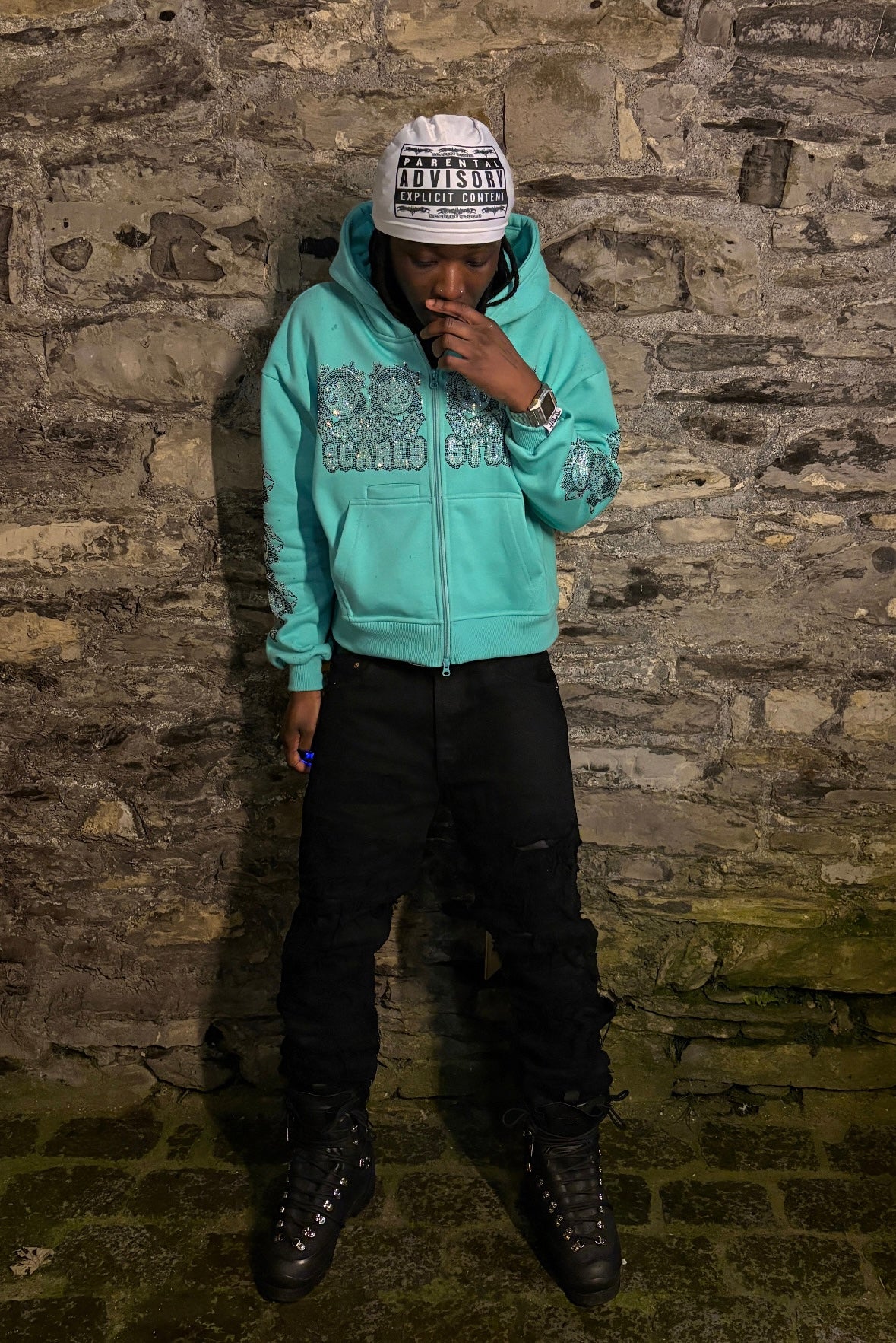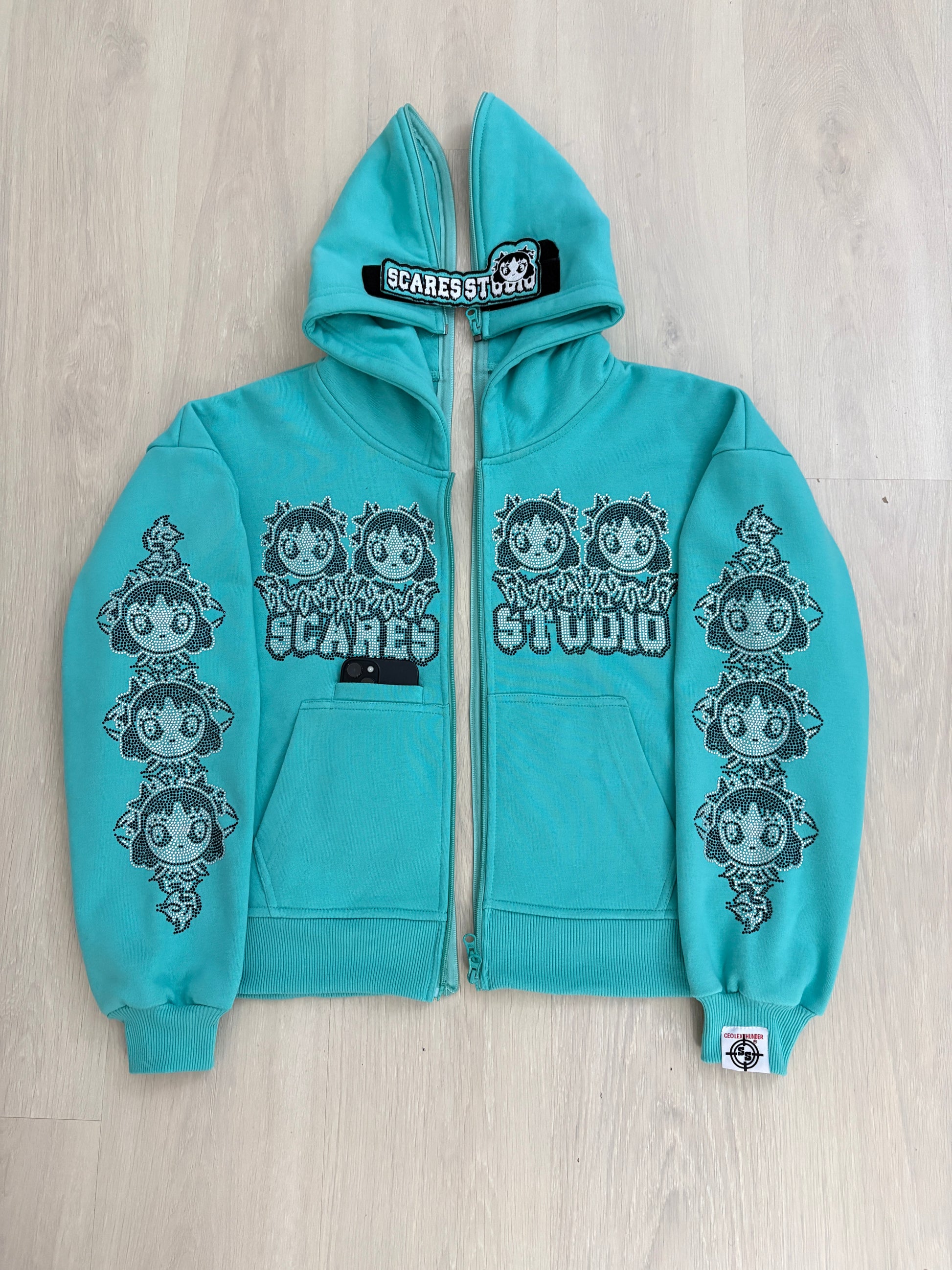 Rhinestone on chest and sleeve & Embroidery patch on the hood cap